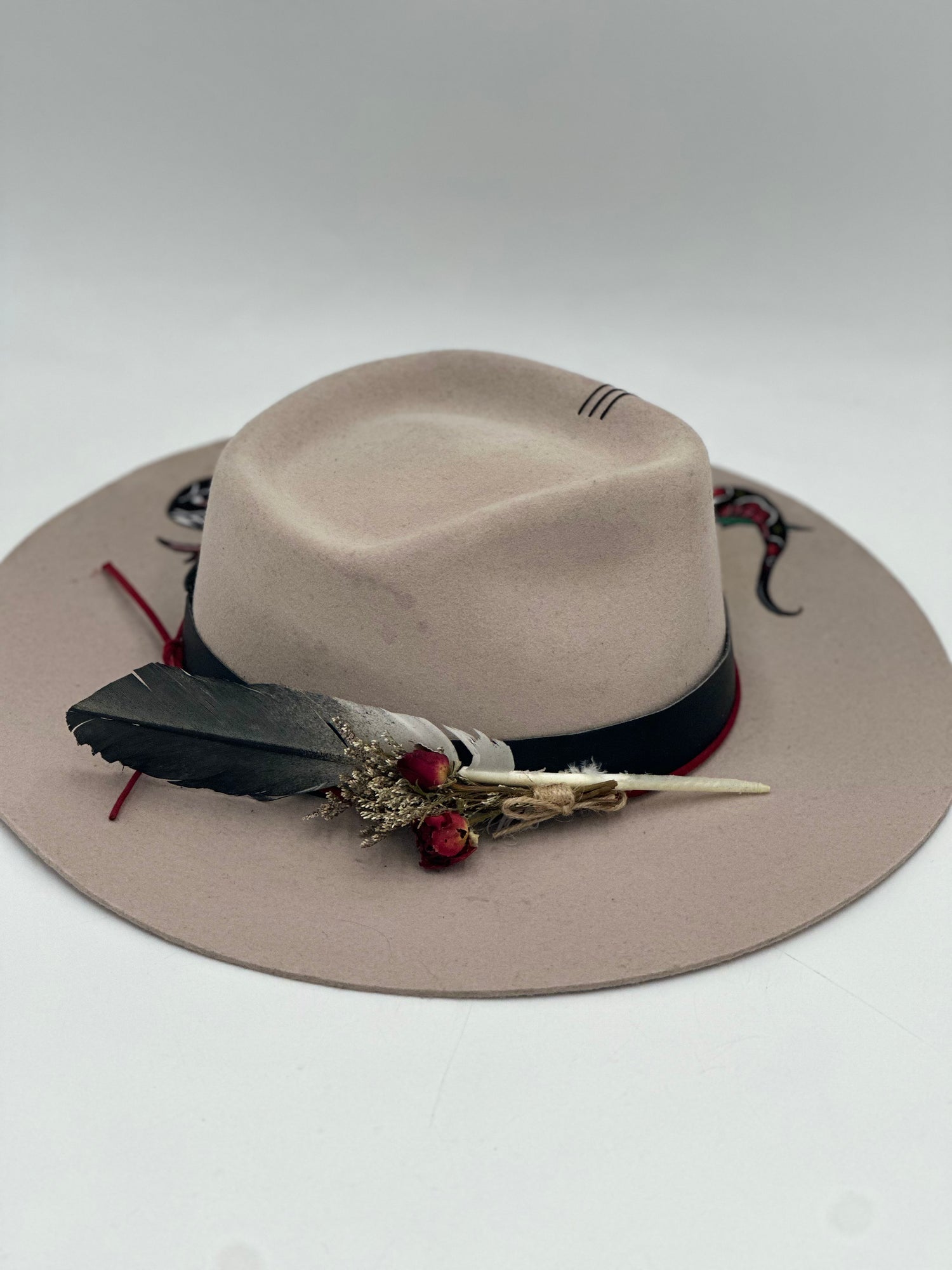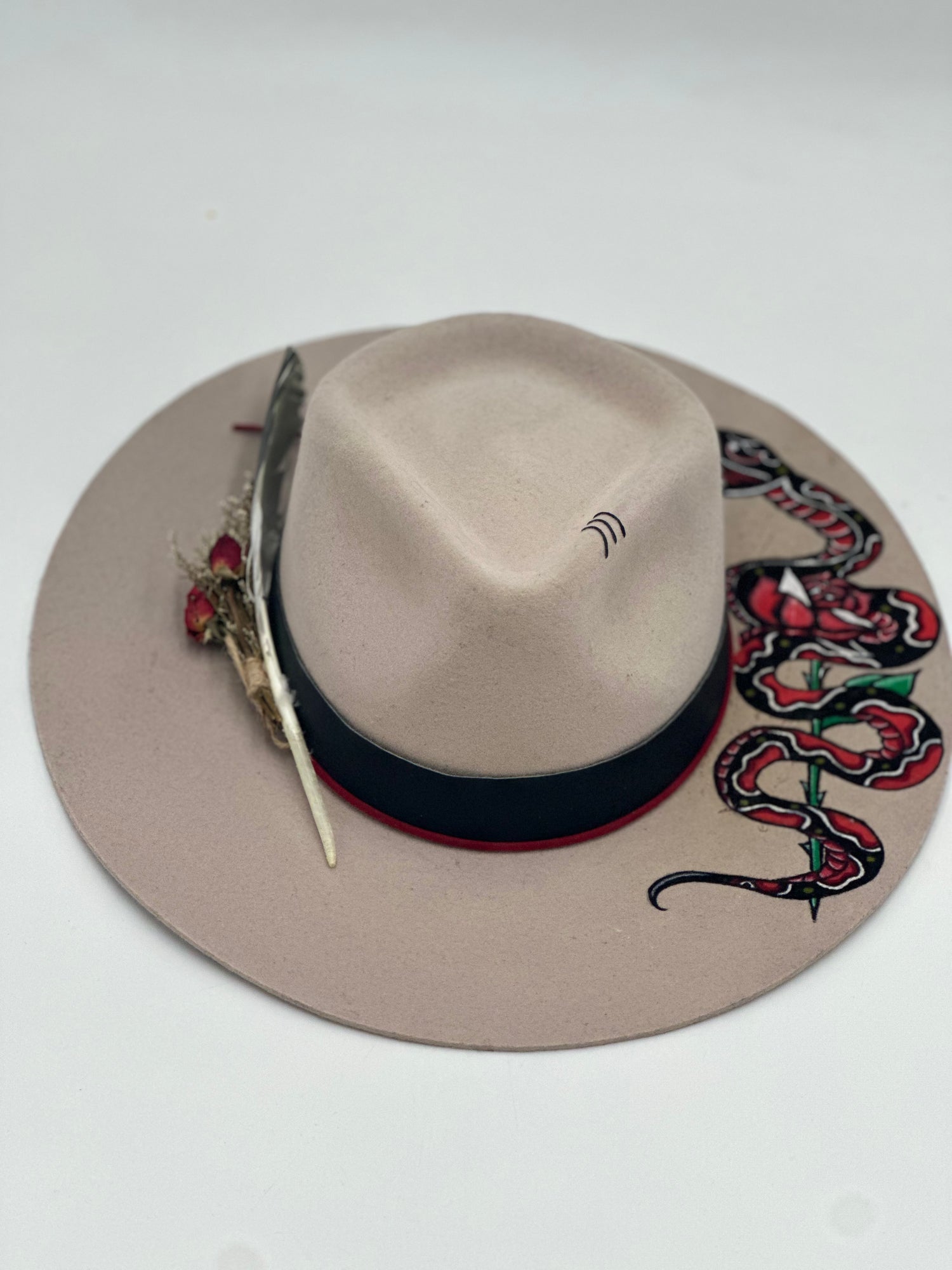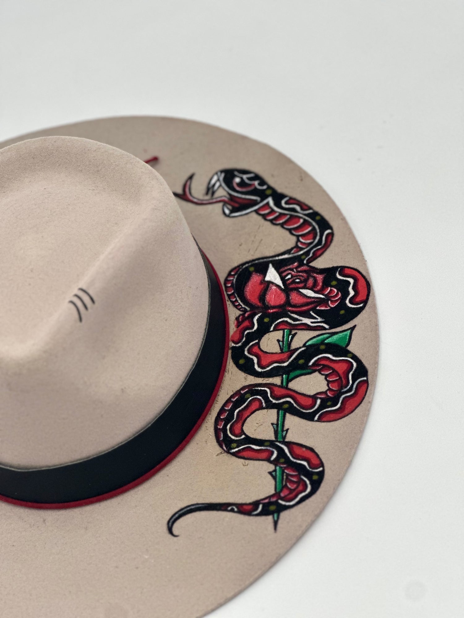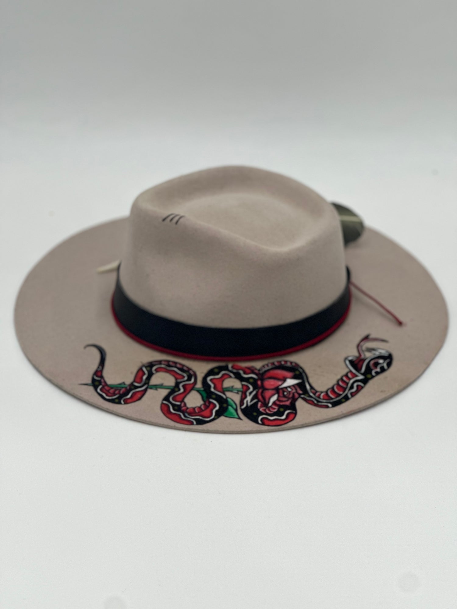 This hand painted black shearling wool hat features a classic snake design with delicate rose patterns. Crafted for a unique, free-hand look, this is sure to bring old school style to any outfit.