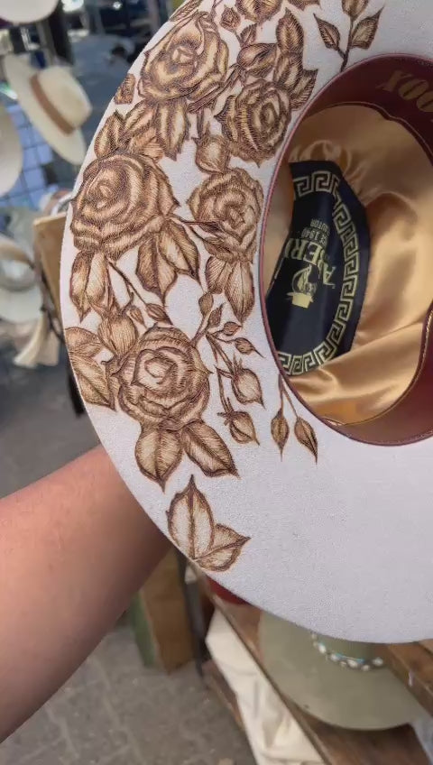 Enhance your winter wardrobe with our luxurious Lam wool hat, made with soft rabbit felt. Hand-burned details add a unique touch to this stylish and warm accessory. Experience ultimate comfort and sophistication with Burned Roses.