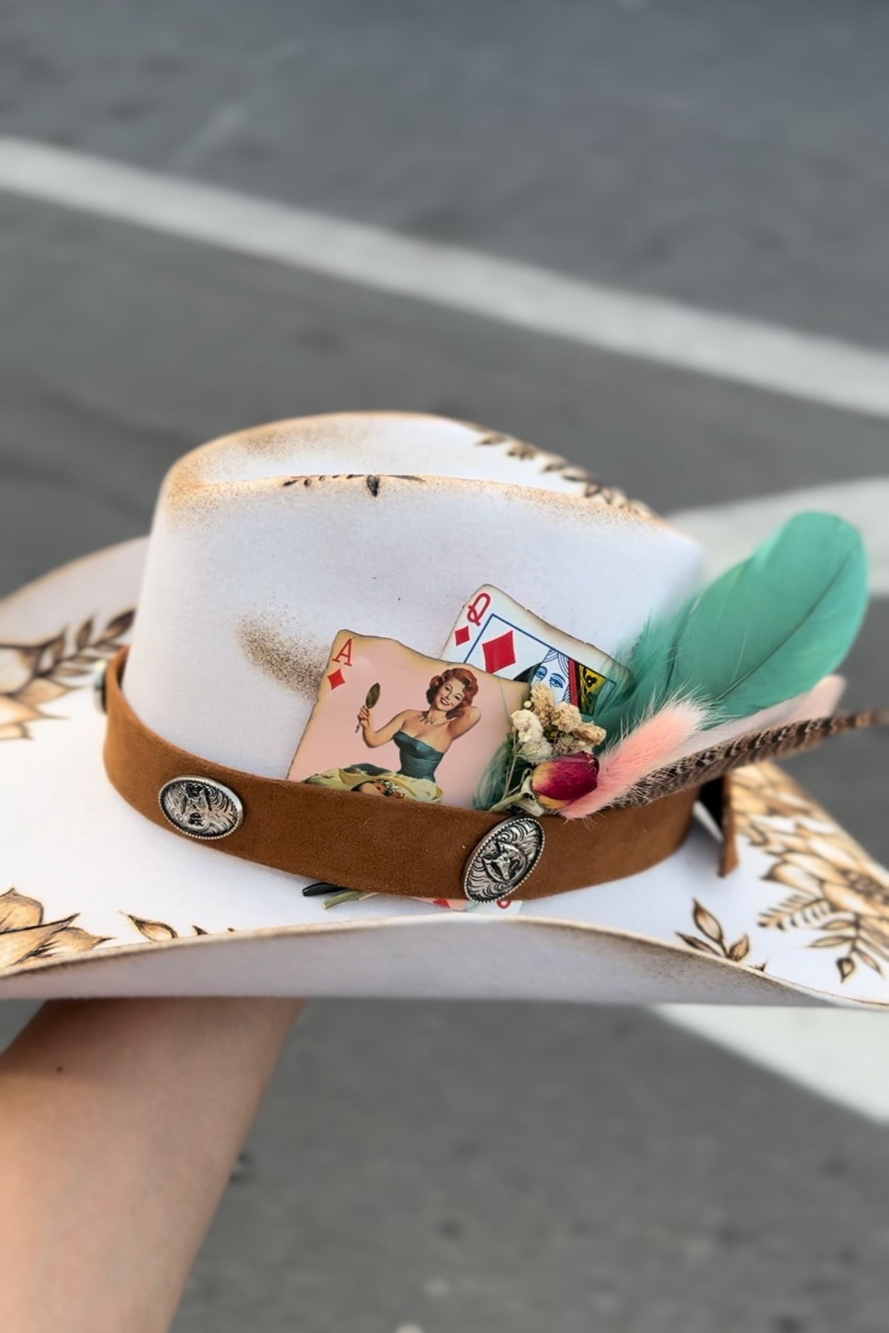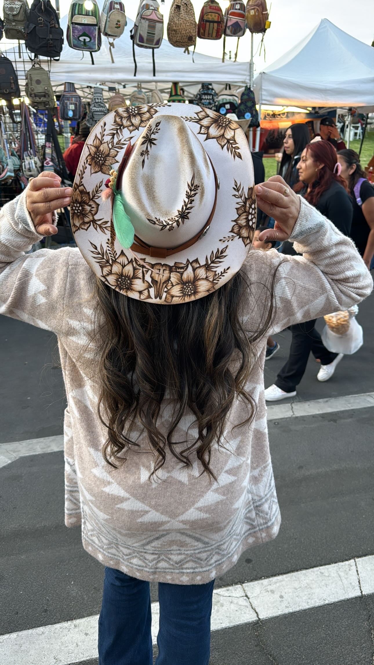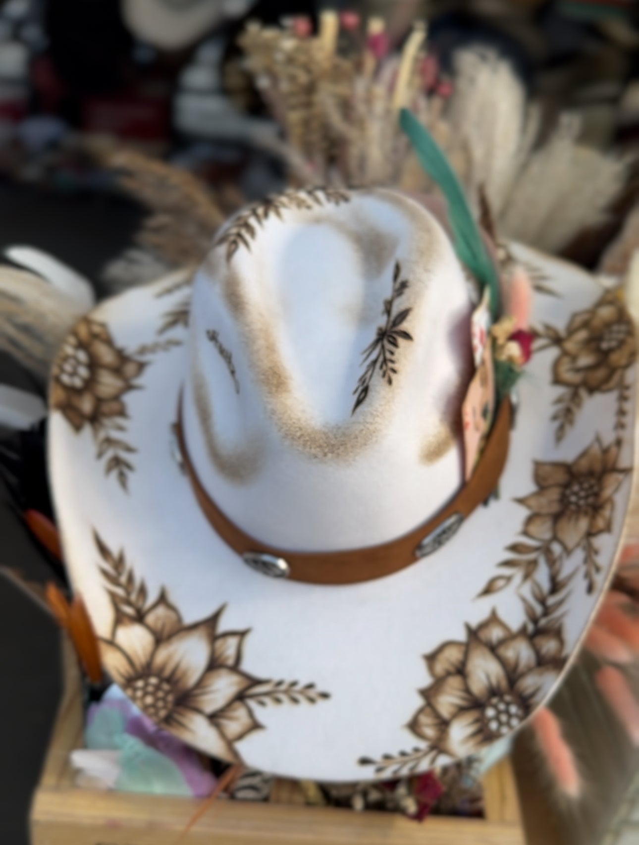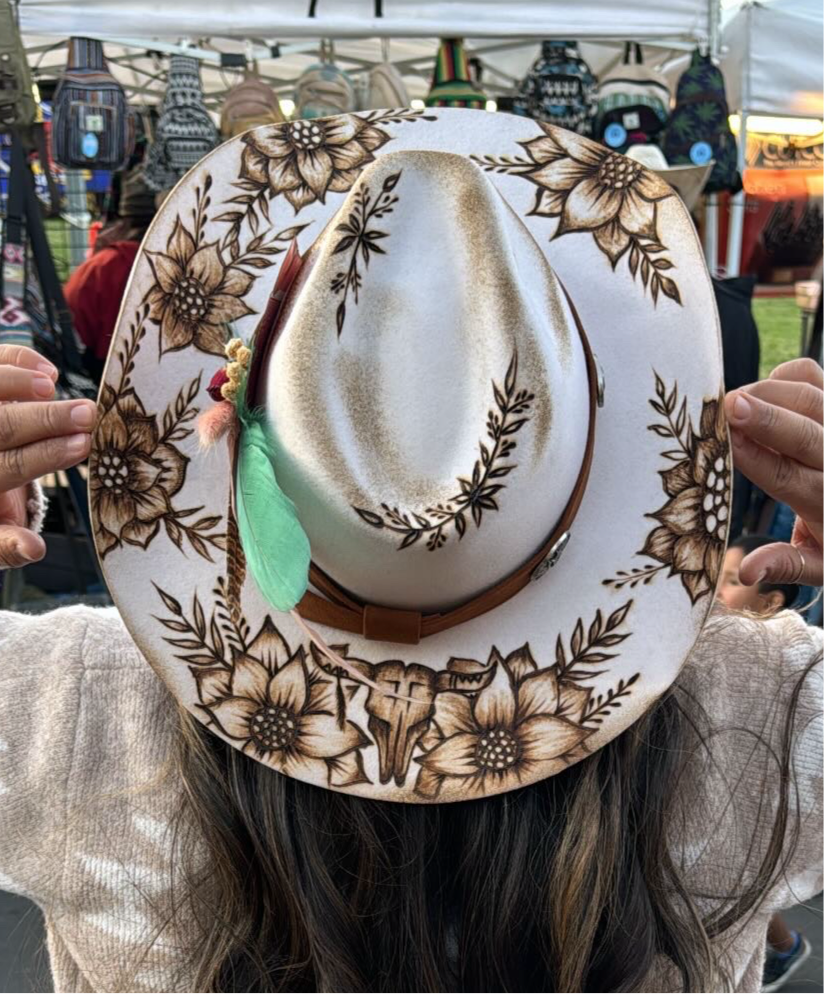 "The Burning Sunflower Rabbit Fur Hat showcases intricate hand-painted burnt sunflowers, making each piece unique. Customize your hat with personal initials or a name, adding a personal touch. Stay warm and stylish this winter with this one-of-a-kind hat."