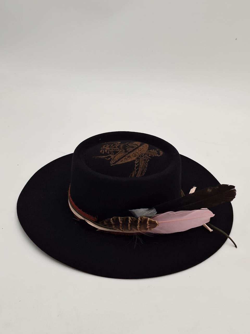 The Catrina Hat is the perfect combination of traditional Mexican culture and modern fashion. Featuring a black hat, each one is burned by hand with bright, colorful details, making each one unique. Enjoy the heritage of Mexico wherever you go!