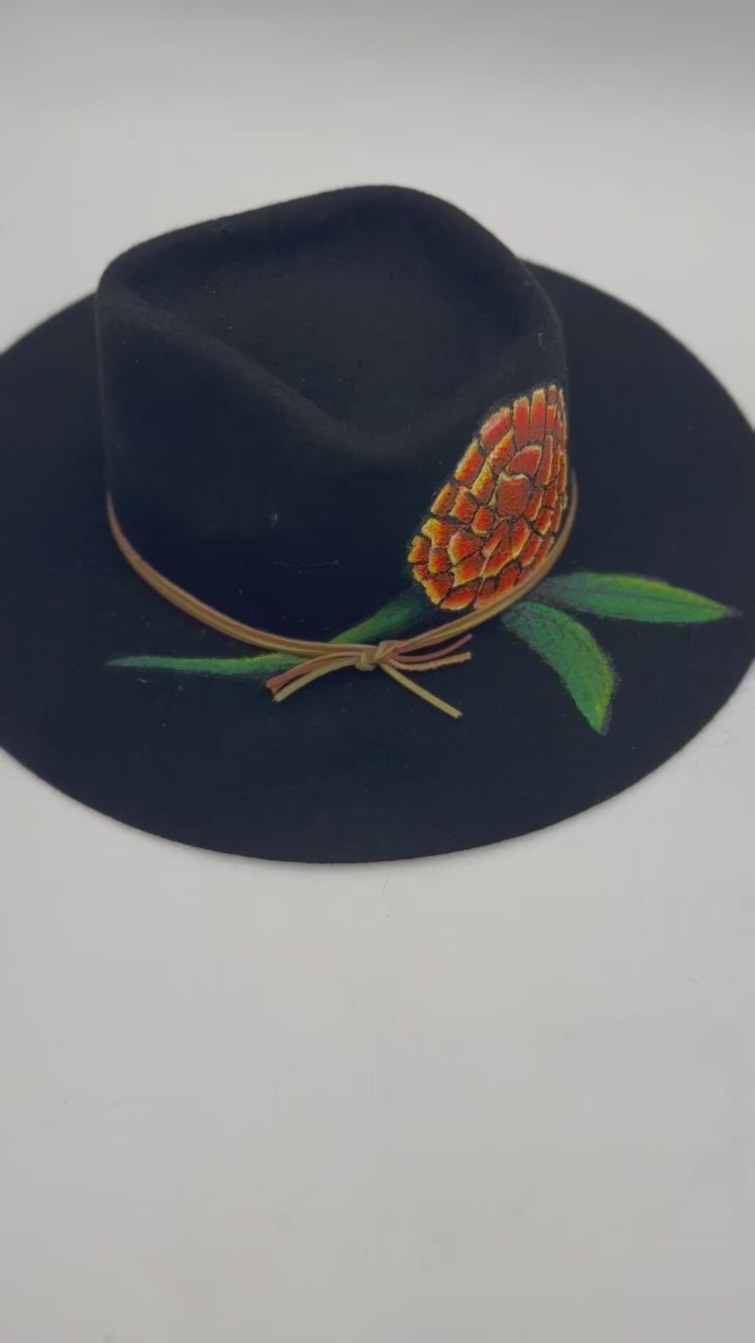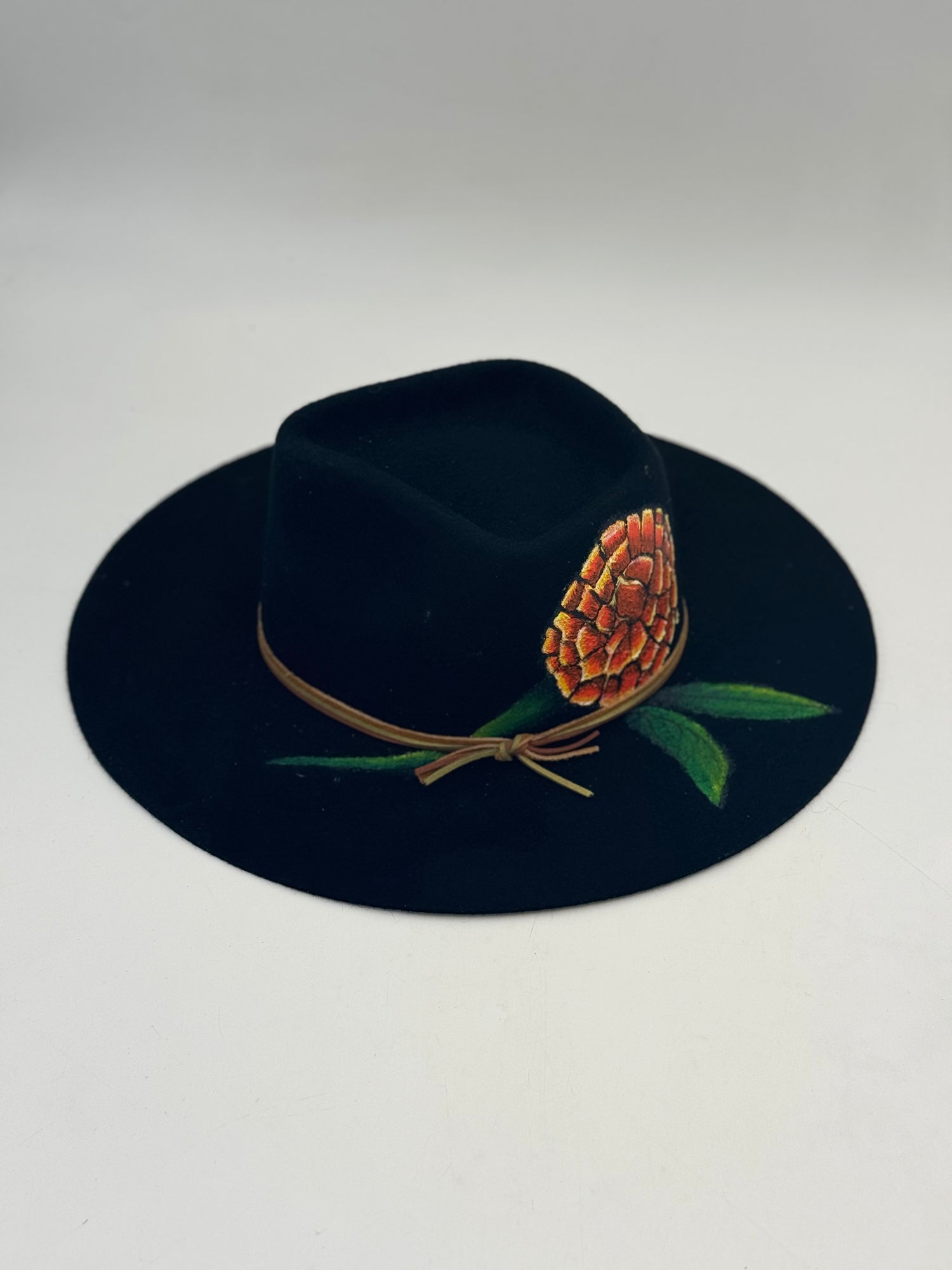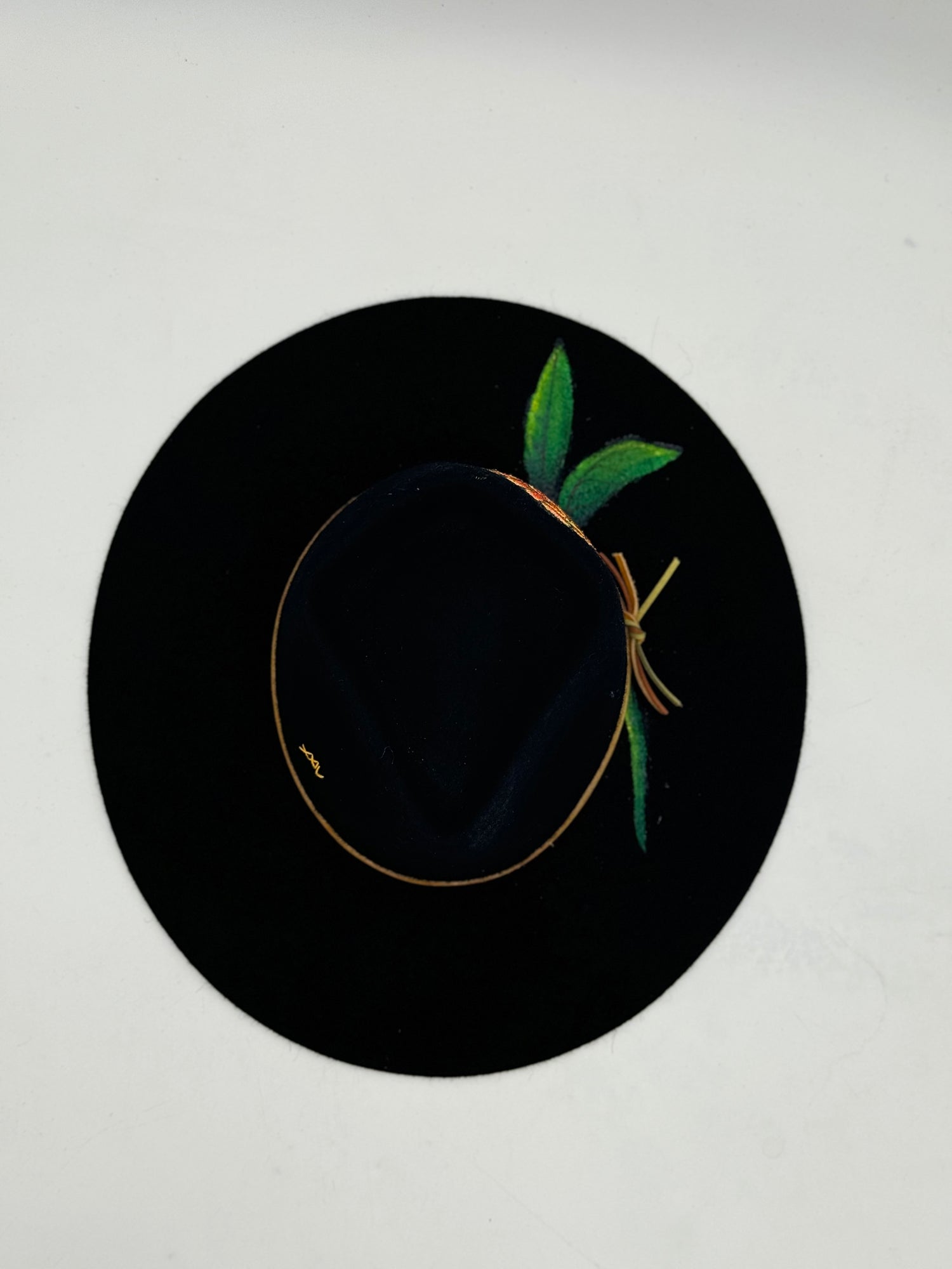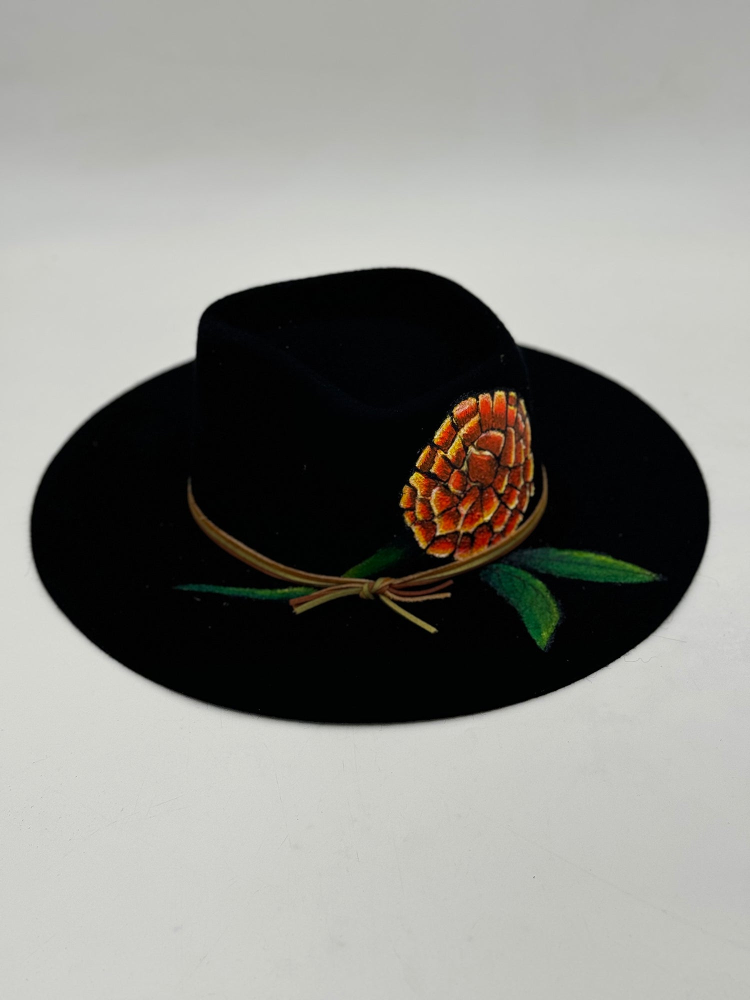 Uniquely hand-painted, this black hat features a striking cempasúchil design symbolizing the journey from death to life. Made with expert craftsmanship and cultural significance, this hat is a statement piece, perfect for honoring Dia de los Muertos traditions.