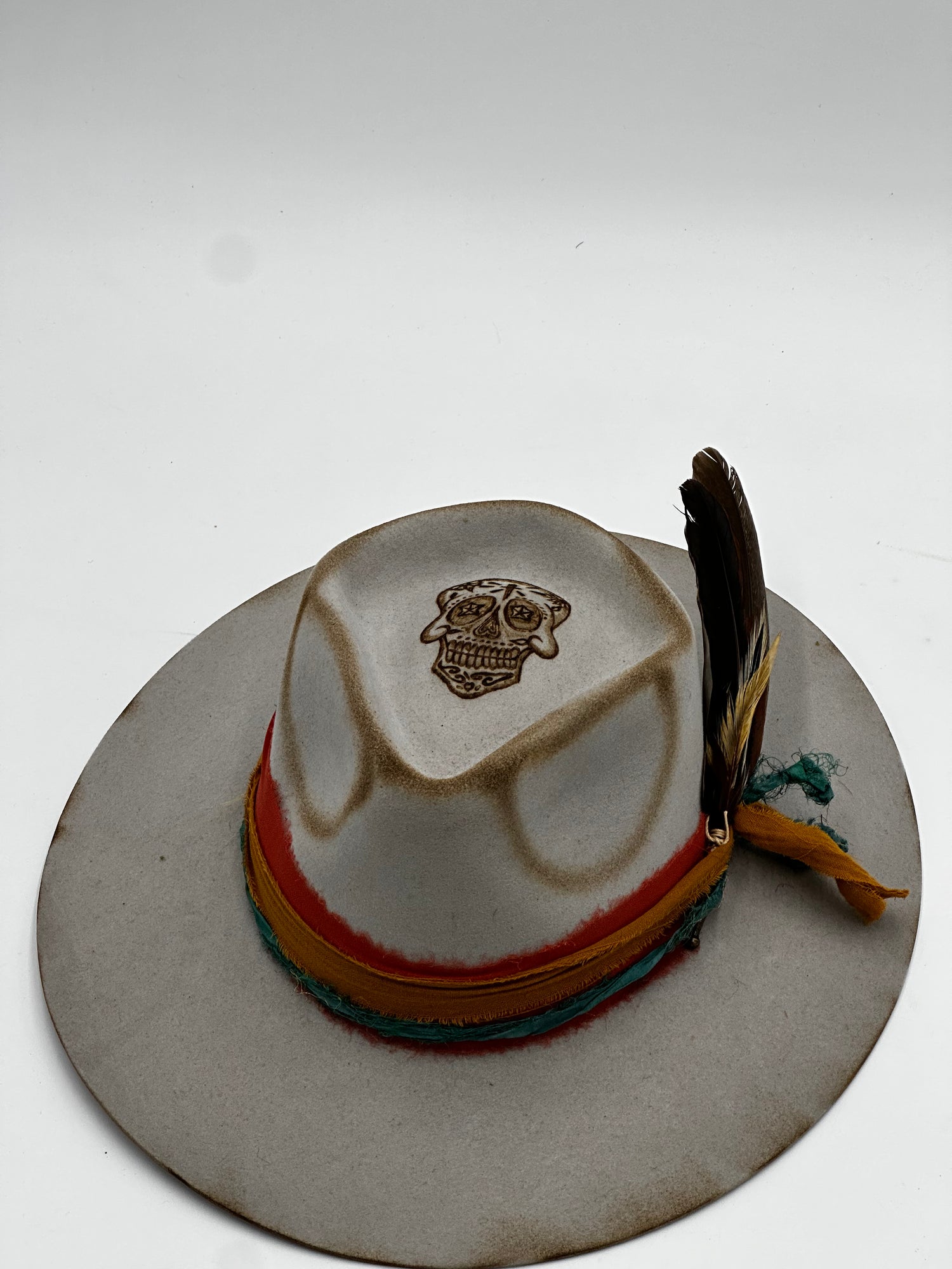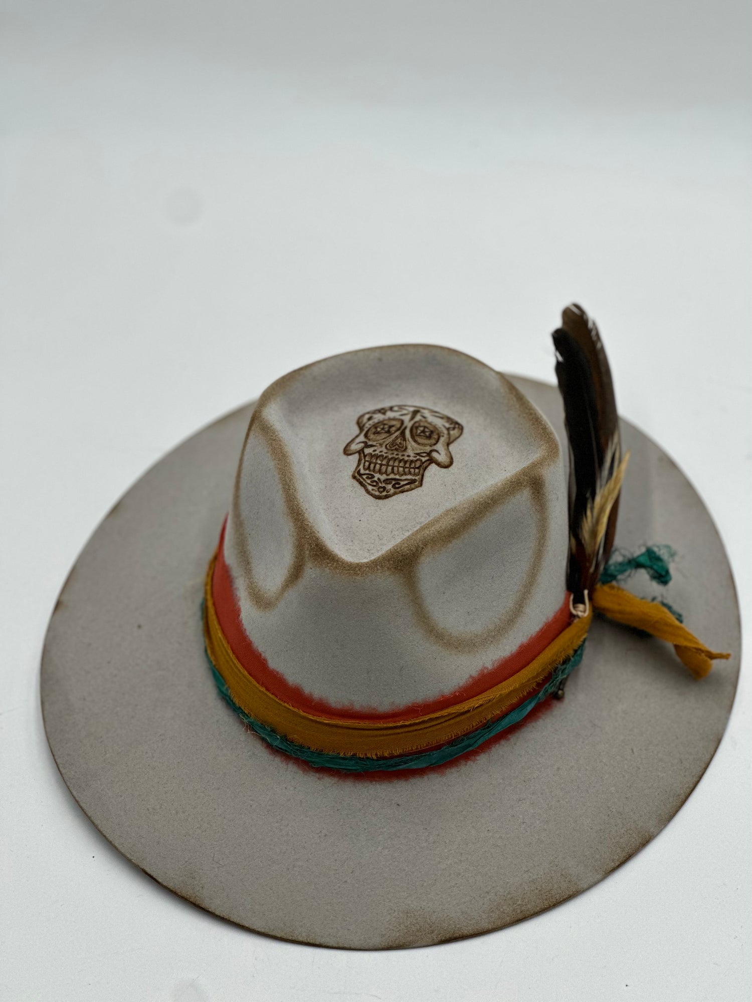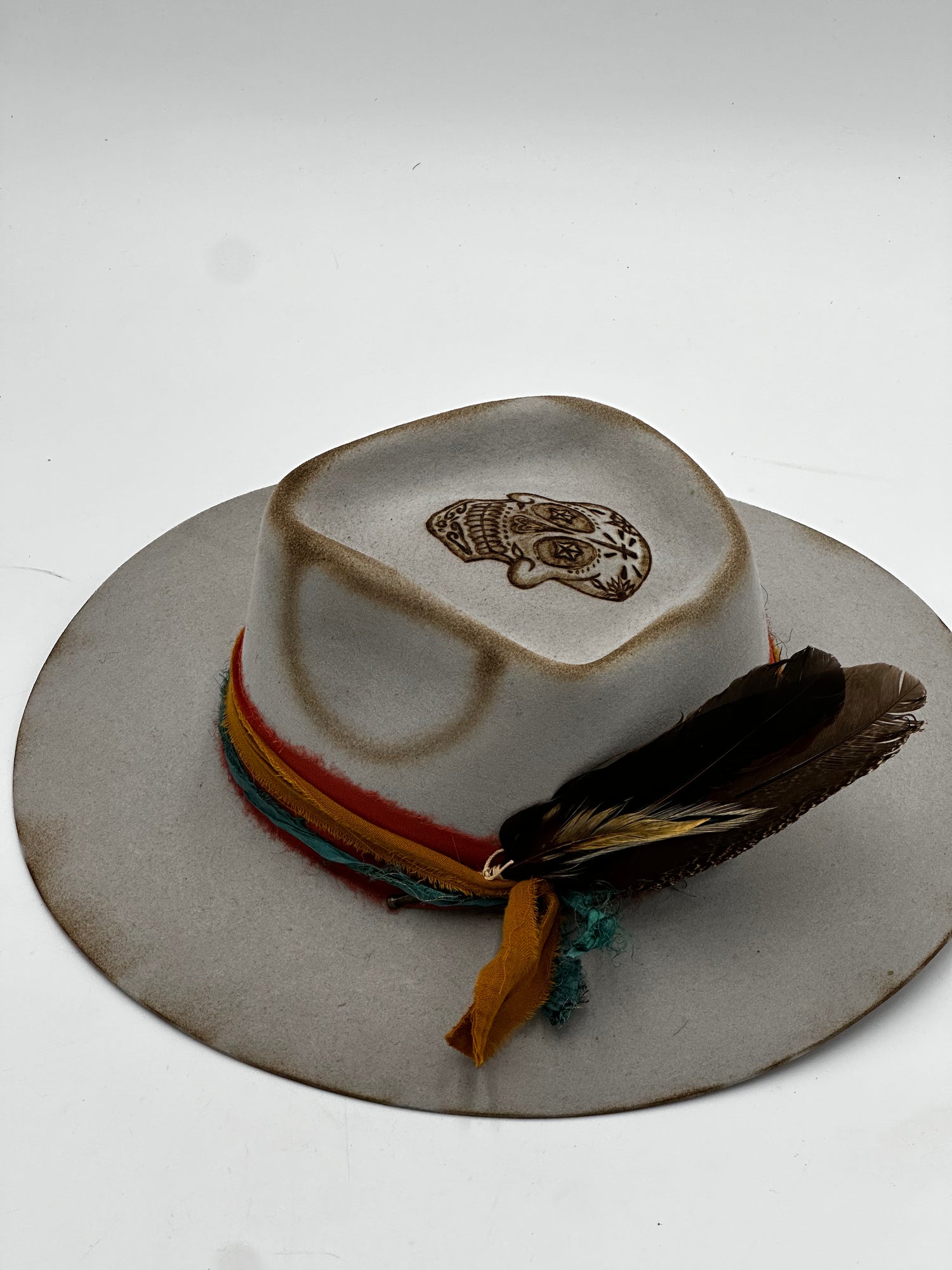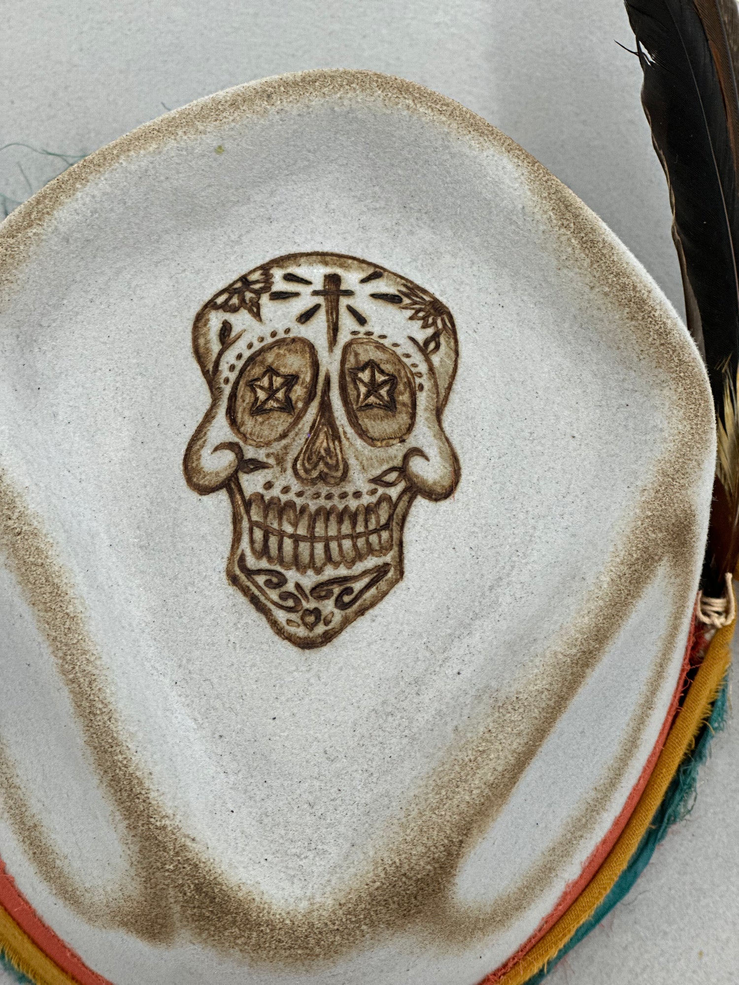 Add a touch of style with this stunning Sugar Skull shearling wool hat. You will be sure to admire the oyster gray color and beautiful burnt engraving of a traditional Mexican skull. Crafted with 30x denomination, it's a must-have accessory this season.